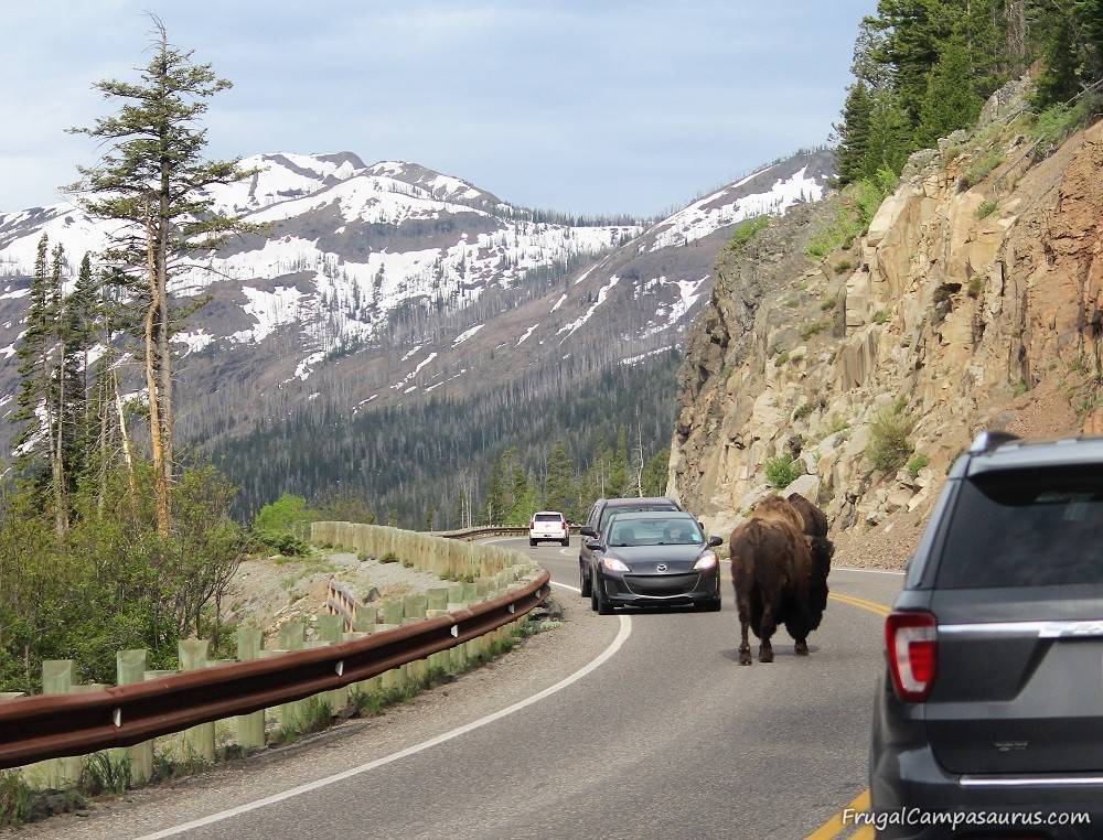 On the way from the East Entrance to Fishing Bridge, we saw 2 more bison. They were right in the middle of the road- on a curve near Sylvan Pass. They were following the road because on 1 side was the mountain and the other was a guard rail with a drop off. Thankfully, we could slowly drive by.