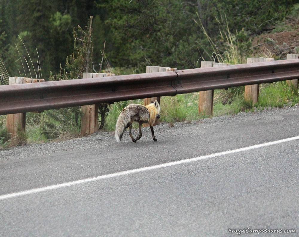 About 1 hour later, on our 30 minute drive to Yellowstone, we saw a bison walking on the road, 2 dear running along the road, and then- a fox!